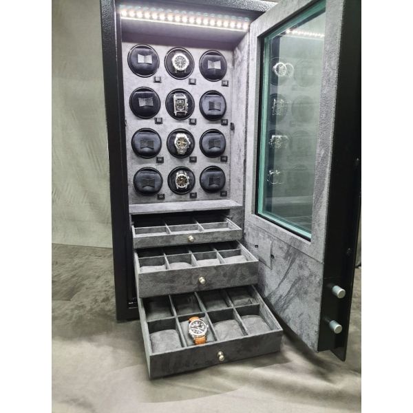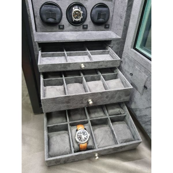 cofre feito em chapa de aço, com pintura eletrostatica , Com vidro blindado preto e interior em couro suede cinza