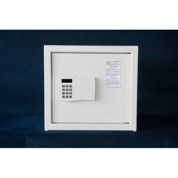 Cofre feito em chapa de aço. Com uma prateleira (removível). Senha do usuário de 04 - 06 dígitos + chave. Senha de emergência. Bloqueio após 05