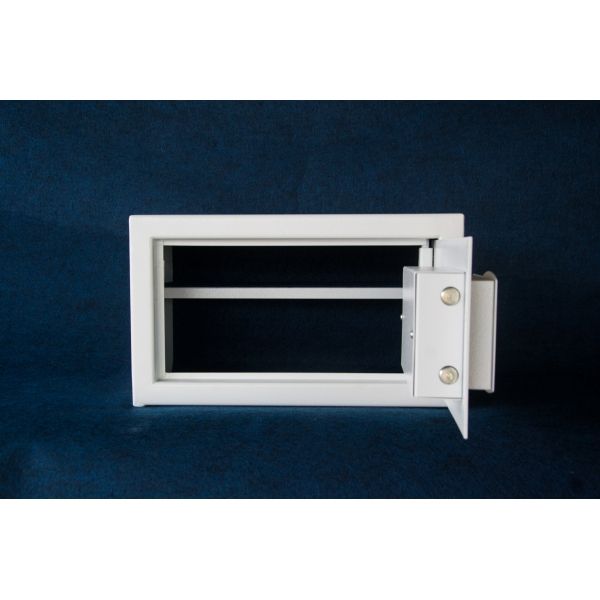 Cofre feito em chapa de aço. Com uma prateleira (removível). Senha do usuário de 04 - 06 dígitos + chave. Senha de emergência. Bloqueio após 05