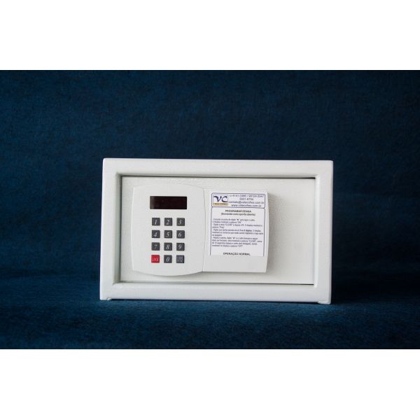 Cofre feito em chapa de aço. Com uma prateleira (removível). Senha do usuário de 04 - 06 dígitos + chave. Senha de emergência. Bloqueio após 05